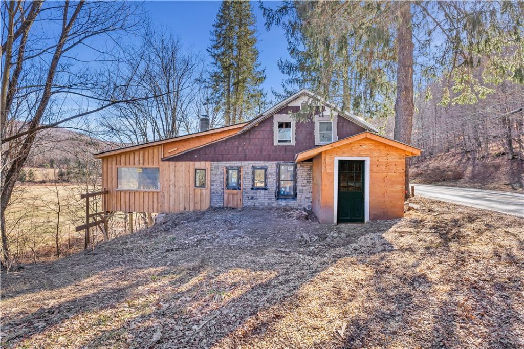 This charming 1940s farmhouse is a special find. It's mid-gut renovation so all the difficult and expensive work has been completed, waiting for you to bring the finishing touches. The design and floorplan layout has been thoughtfully re-imagined. A professional interior designer has transformed it from a 1-bed/1-bath (1,146 sq ft) to a 3-bed/2.5-bath (1,542 sq ft), enhancing space, flow, and natural light. Designed to blend indoor and outdoor living, the home boasts high ceilings, energy-efficient Pella and Marvin windows, and sliding doors that open to an eventual deck overlooking a stunning meadow and mountain view. The main floor features a spacious living room/kitchen, a new mudroom, and a light-filled primary bedroom with an en suite bath. A circular pea gravel driveway, 200-amp electric service, all-new plumbing, a washer/dryer hookup, and a coffee bar/wet bar sink have been installed. The upstairs offers two well-sized bedrooms and a full bath, with newly framed ceilings for added height. Situated on 4 acres, the property includes a 2-story barn across the road, with potential for a garage, workshop, cabin or studio conversion. Located in North Branch, a peaceful hamlet near Livingston Manor, Callicoon, and Jeffersonville. Being sold as-is, the asking price takes into account the completed renovations and the remaining work. Some building materials and fixtures are included, with additional remodel items available for purchase. Contents that are included in the sale: Drywall panels, Batting insulation, Marvin sliding window (for upstairs bedroom), Pella Window (for second upstairs bedroom), Vintage wooden shutters (for street-side exterior), Fiberglass clawfoot tub and plumbing fixture, Upstairs vanity, bar sink and faucet, 2 matching chandeliers for living room, Vintage brass chandelier for mudroom, Marvin French door (for living room), Decking wood. Other items can be negotiated.